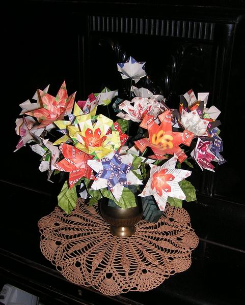A teatasakokból vágott négyzet, vagy téglalap kiszabása után megmaradr "maradék" teatasak darabokból készített virágok.