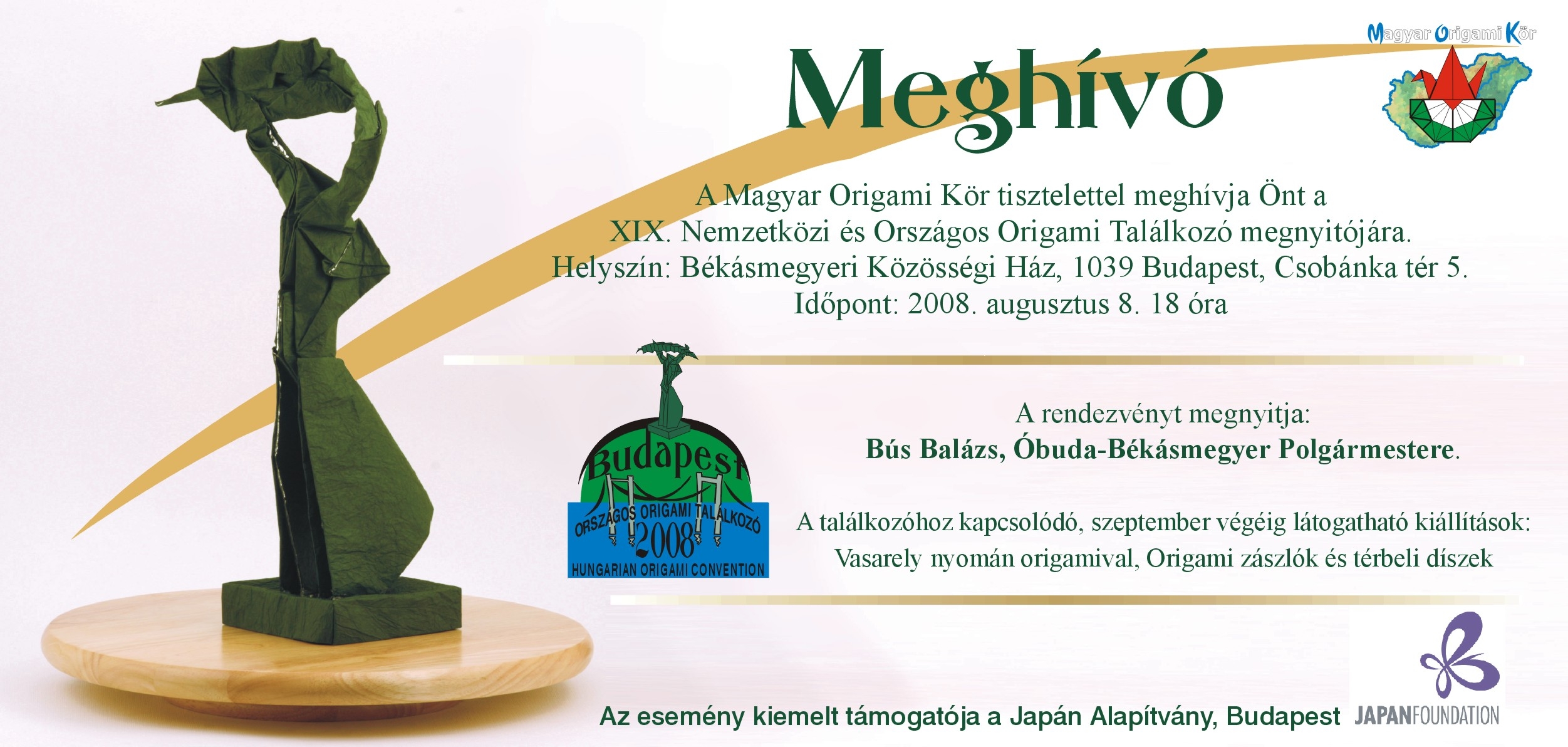 Szeretettel várunk minden érdeklődőt a 2008. augusztus 8-10 között megrendezésre kerülő XIX. Országos Origami Találkozóra.