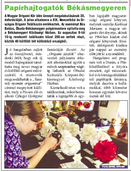 Újabb cikk adott hírt az origami találkozóról az Óbuda újság XIV. évfolyam 18. számában 2008.09.15-én a 13. oldalon.