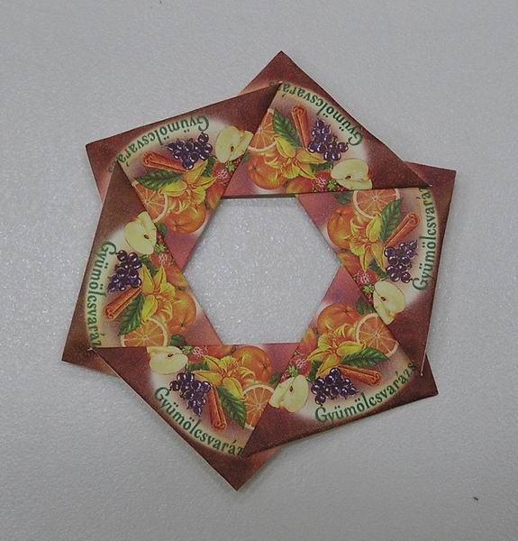 A teatasakból vágott négyzeten szalvétahajtást (sarokhajtást) végzünk, majd 6 db-ot összeillesztünk a minta segítségével szabályos formára.