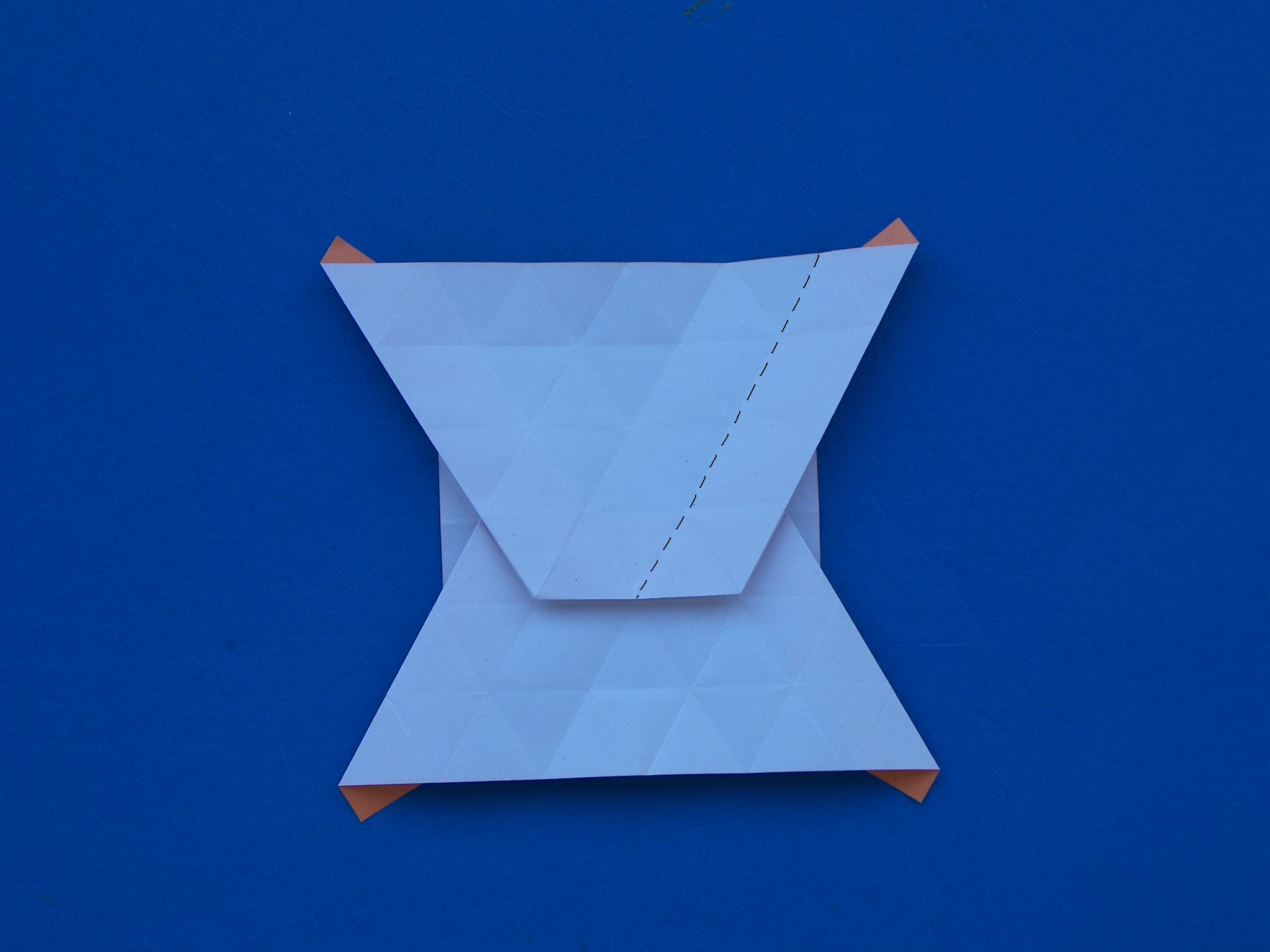 4. Hajtsd fel a jelölés szerint, igy a modell 3-dimenziós lesz. Csinálj egy "háromszögű csavaró hajtást", lásd a következő két képet.