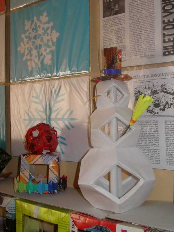 A hóembert három lecsonkított kockából (cuboctohedron) állítottam össze, amit 8 db 15x15 cm-s, 8 db 10,5x10,5 cm-s és 8 db 7,5x7,5 cm-s fehér négyzetekből állítottam össze, Tung Ken Lam háromszögú moduljából.