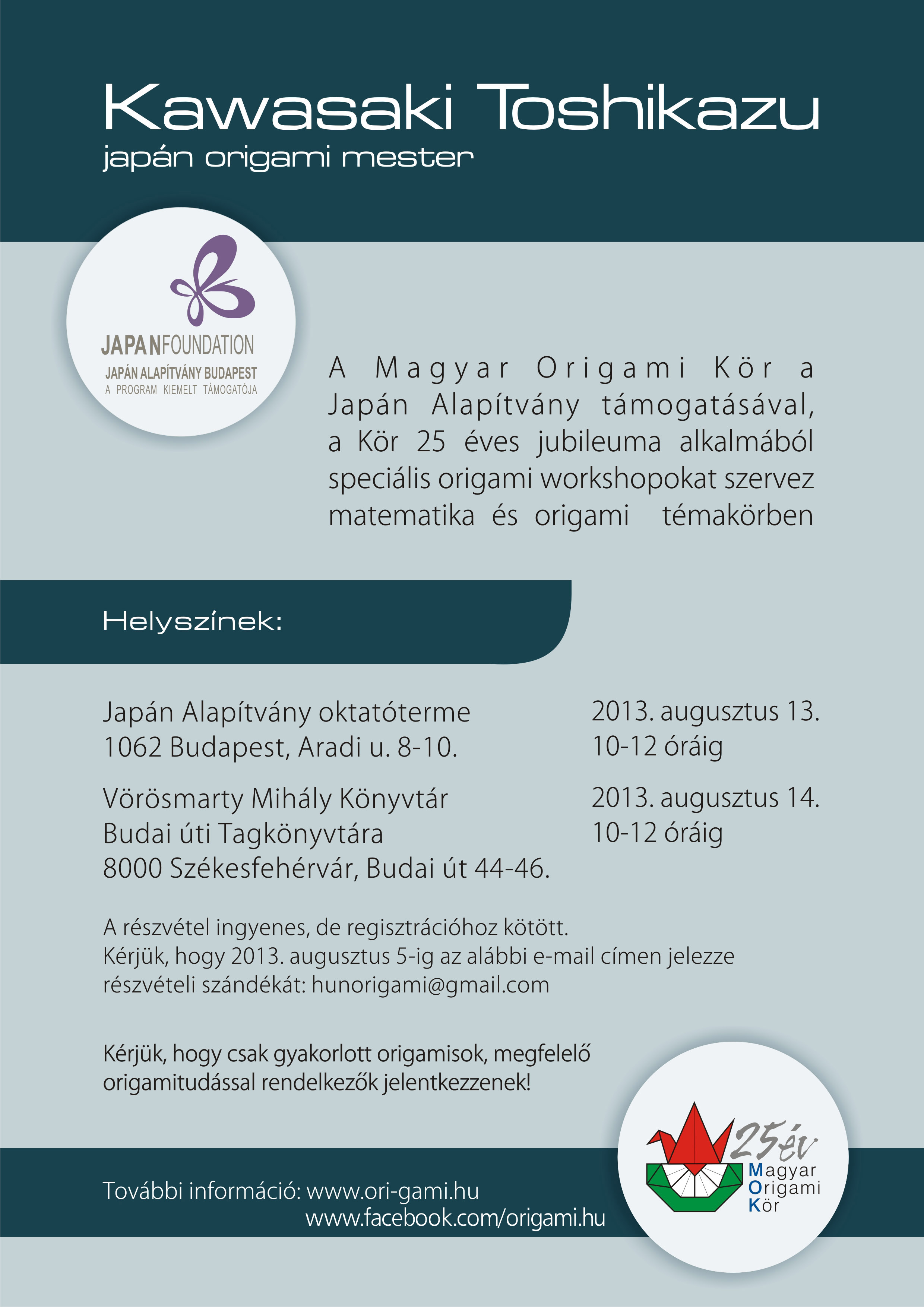 A részvétel ingyenes, de regisztrációhoz kötött. Kérjük, hogy 2013. augusztus 5-ig az alábbi e-mail címen jelezze részvételi szándékát: hunorigami kukac gmail pont com